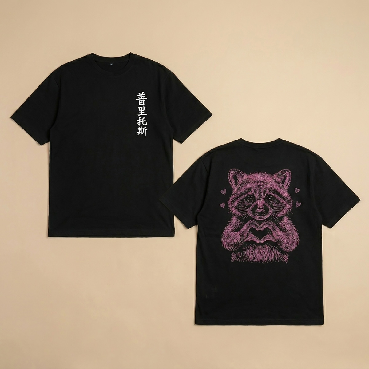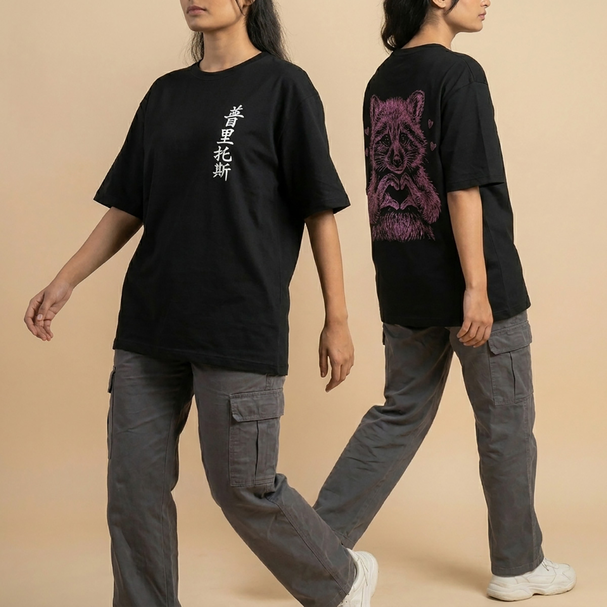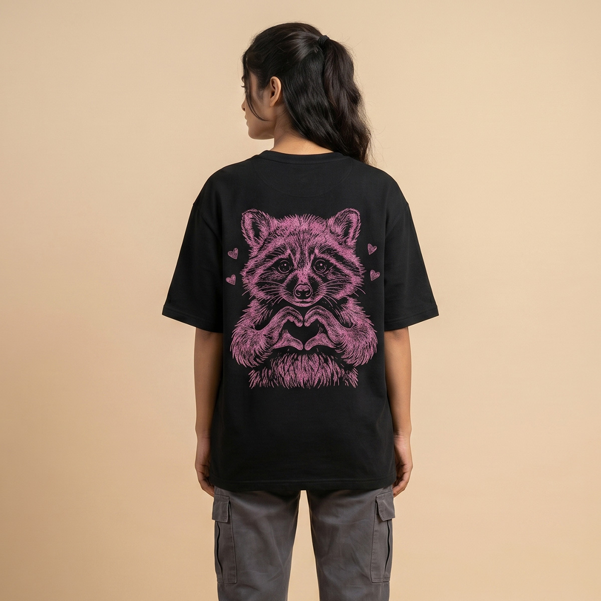 The Prithos Raccoon Love Oversized T-Shirt blends cuteness with character. Featuring a charming raccoon graphic, this piece brings warmth, personality, and effortless aesthetic appeal.